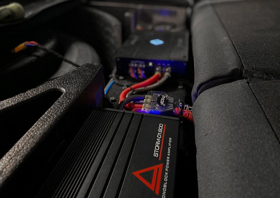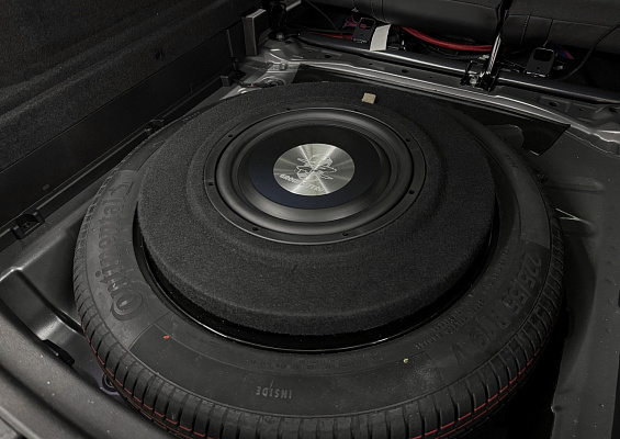 За сабвуферное звено отвечает плоский сабвуфер Ground Zero GZRW 300-D2 Flat, в стелс-коробе, который мы изготовили в запасное колесо и моноблок Aura Storm-D1.600.