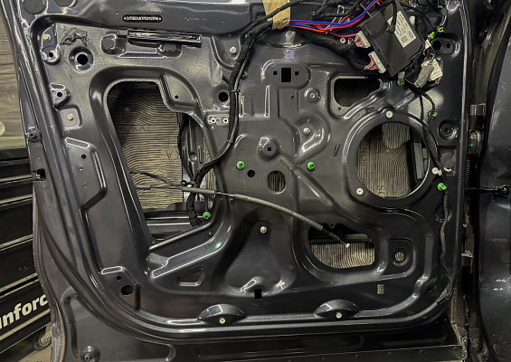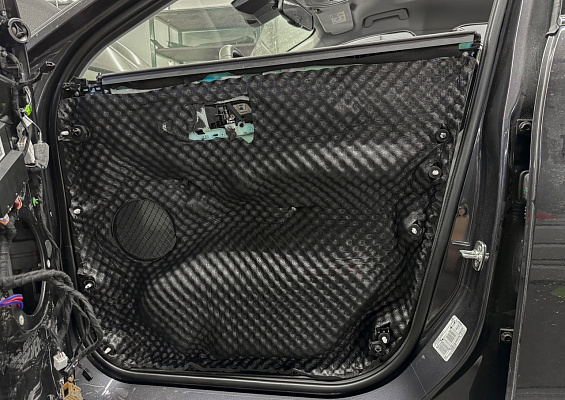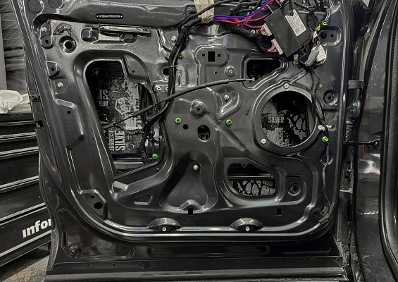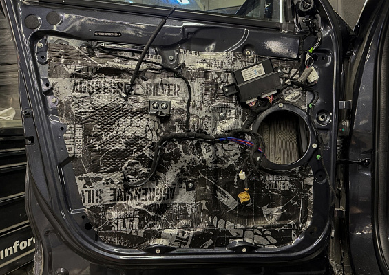 Первым слоем на внутреннюю и наружную рубашку двери нанесли виброизоляцию STP Aggressive Silver, вторым слоем смонтирован шумоизолятор STP Sonora, на обшивки дверей установлен шумопоглотитель STP Biplast Profi 15.