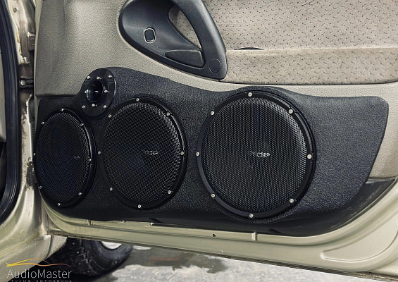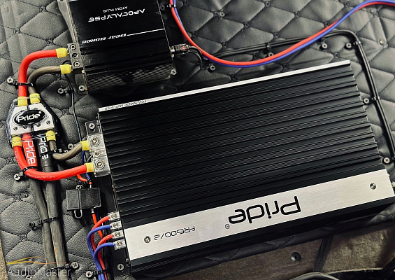 При помощи накладных подиумов установили 3 пары эстрадных динамиков Pride Diamond 8 ver.3, подключена акустика к 2-х канальному усилителю Pride FR 1500/2, а рупорные ВЧ Pride Solo 40 играют напрямую от головного устройства - Pioneer MVH-S520BT.