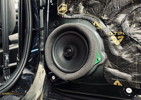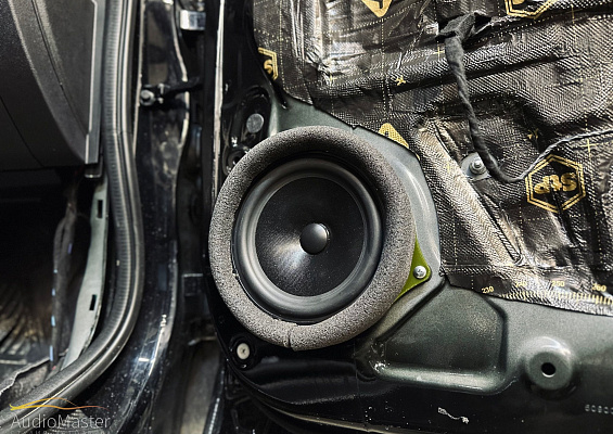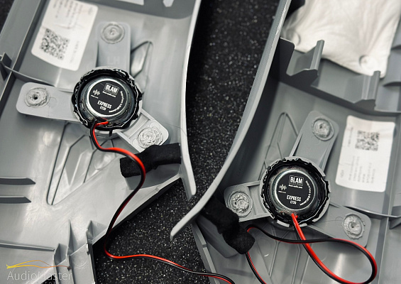 Акустика установлена по штатным местам, при помощи проставочных колец, которые мы напечатали на 3Д принтере. На фронт установлена 2-х компонентная акустика Blam 165ES, в качестве тыловой акустики выступили коаксиалы Oris JB-652S.
