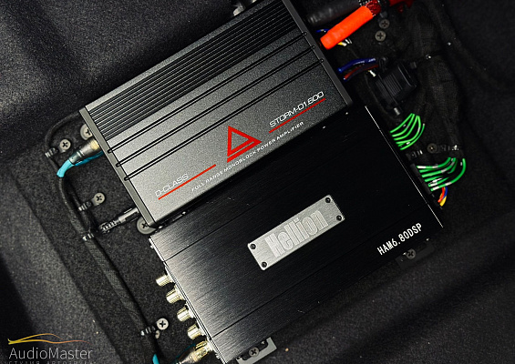 Усилители расположились под водительским сидением. Это моноблок Aura Storm - D1.600 и процессорный усилитель Hellion HAM 6.80 DSP, который и управляет всей аудиосистемой.
