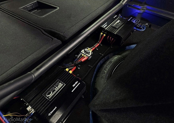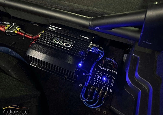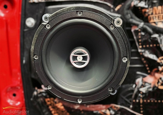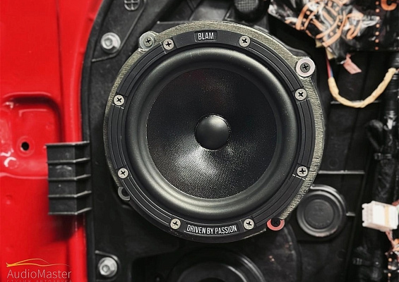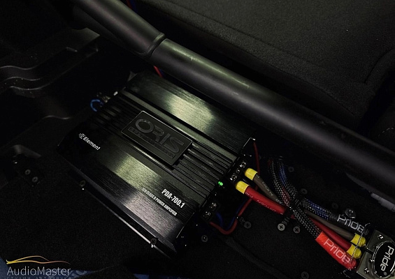В передние двери, при помощи проставочных колец, была установлена 2-х компонентная акустика Blam 165 ES, в задние двери установили коаксиальные Focal Auditor ACX 165. Все это играет от 4-х канального усилителя Oris PDA-100.4.
