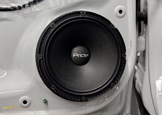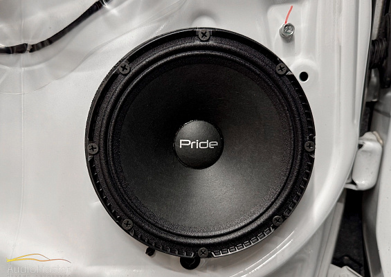 В передние и задние двери автомобиля установили эстрадную акустику Pride Solo 200 6,5 Competition. Динамики подключили от 4-х канального усилителя Aura Storm-D4.200.