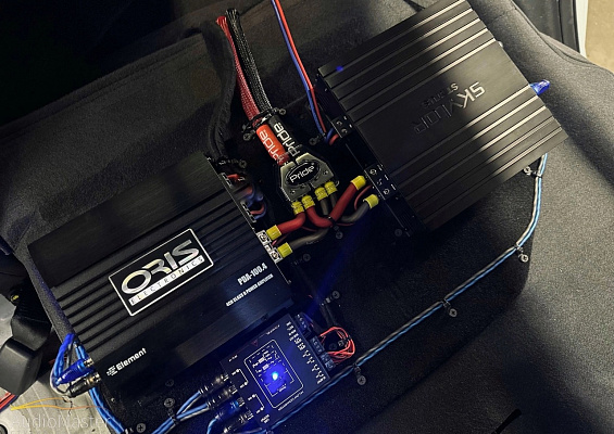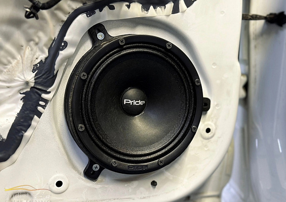 В передние и задние двери установили эстрадную акустику Pride Ruby Voice 6.5 v.2, которая играет от 4-х канального усилителя Oris PDA-100.4. Сабвуфер Pride M9 12” v.2 был установлен в короб на 160-й трубе и подключен к моноблоку Skylor ST-1.1500D. Сигнал для усилителя сняли с помощью преобразователя высокого уровня Aura RHL-4.