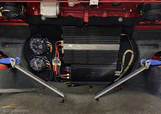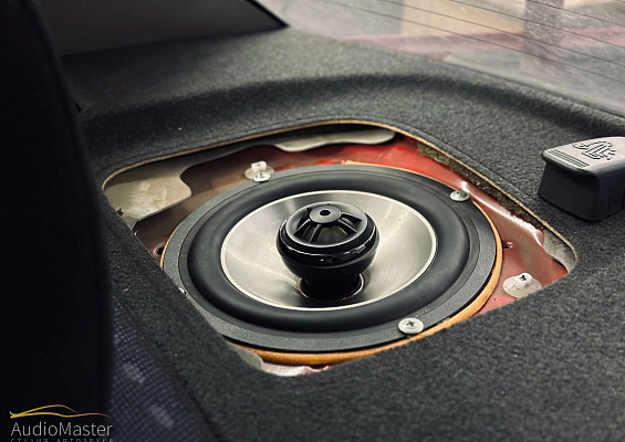 Заменили акустику в передних дверях и установили 2х компонентную акустику - Kicker RS65.2, а на тыл, в полку была установлена коаксиальная акустика - Alpine SPR-174A, данные компоненты владелец привез нам самостоятельно. Данную акустику мы подключили к 4-х канальному усилителю Aura Venom-D4.200. А также, был установлен 2-х канальный усилитель Calcell BST 250.2, для подключения будущего сабвуфера.