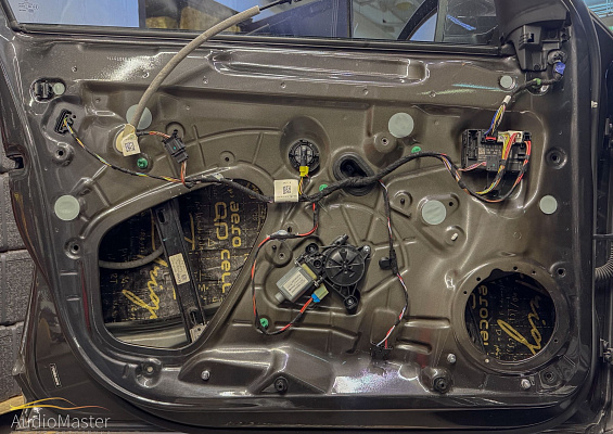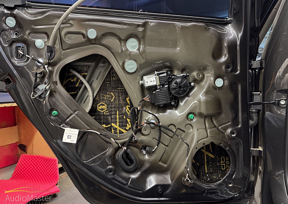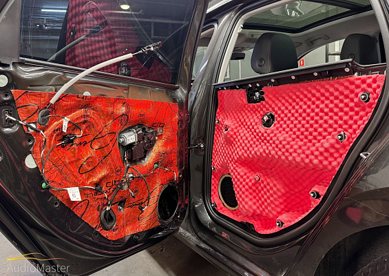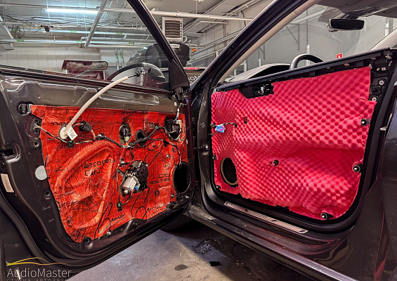 На внутреннюю рубашку двери нанесли вибродемпфер Aerocell QP Intrigo 6mm, наружную часть двери обработали Aerocell QP Genio 4mm, на обшивки дверей нанесли шумопоглотитель STP Biplast Premium 15A Armor.