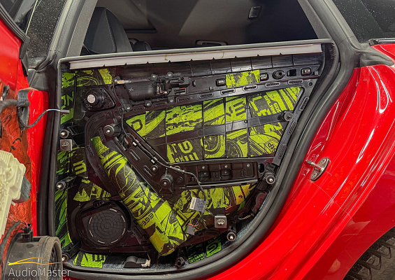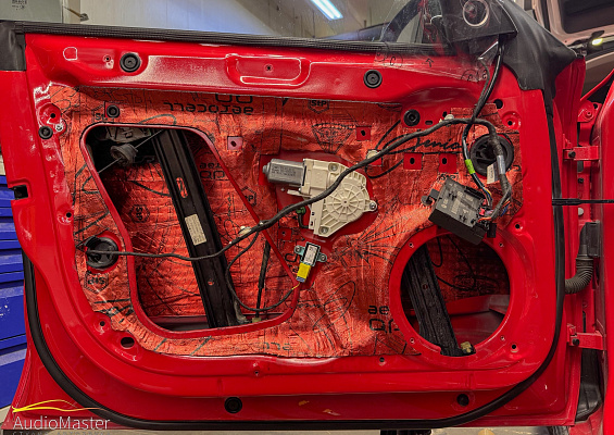 На внутреннюю и наружную рубашку двери нанесли вибродемпфер Aerocell QP Genio 4mm, на обшивки дверей первым слоем нанесли виброизоляцию Legend 2, вторым слоем нанесли шумопоглотитель Biplast Premium Red.