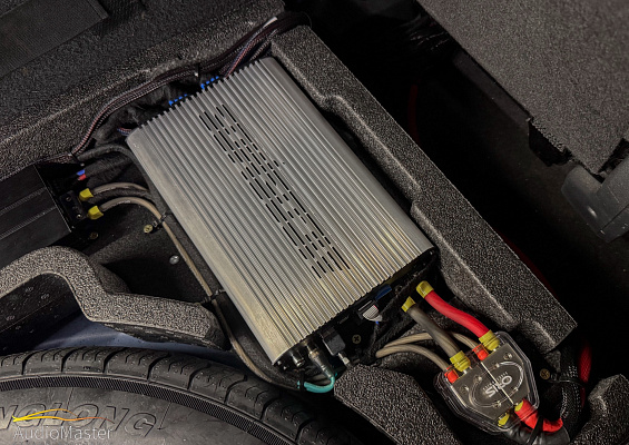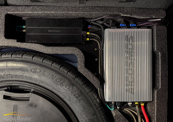За сабвуферное звено в системе отвечает 10-ти дюймовый сабвуфер Audio System R10 EVO и усилитель Hellion HAM-2.800D.