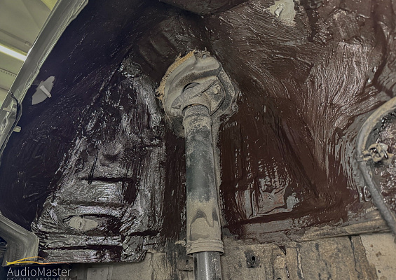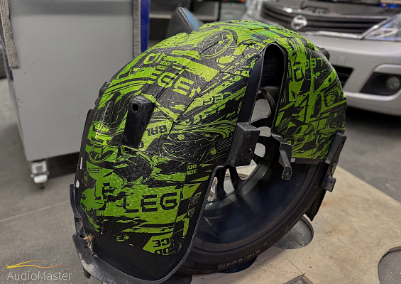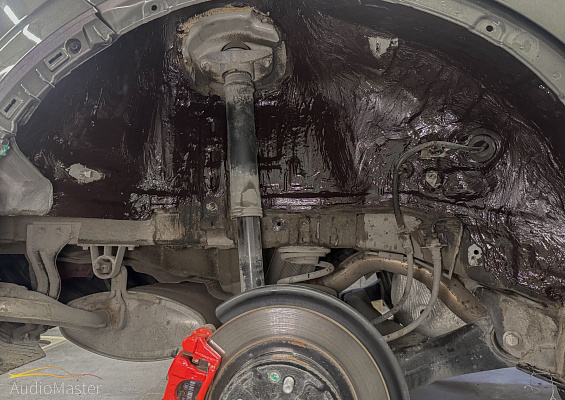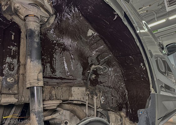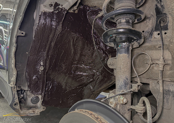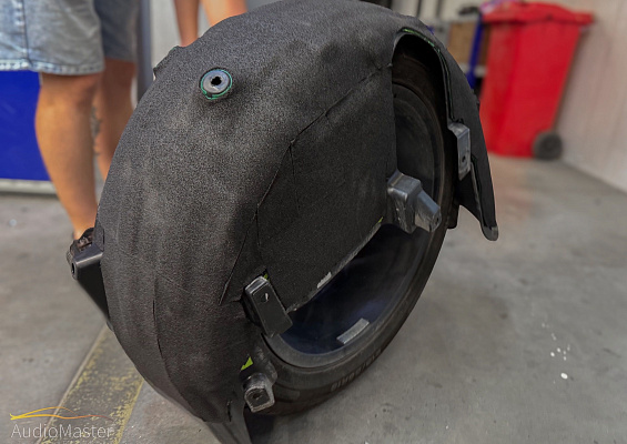 На металл арки нанесли 2-х компонентную мастику StP NoiseLiquidator. Пластиковые подкрылки обработаны виброизоляцией STP Legend 2 и теплоизоляцией STP GreenFlex 4.